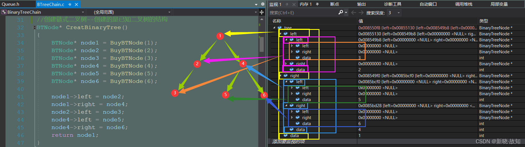 此处学习链式二叉树,是为了学习它的结构,掌握控制方法,为了后序学习更复杂的搜索二叉树等做铺垫。