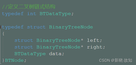 //定义二叉树链式结构 typedef int BTDataType; typedef struct BinaryTreeNode { struct BinaryTreeNode* left; struct BinaryTreeNode* right; BTDataType data; }BTNode;