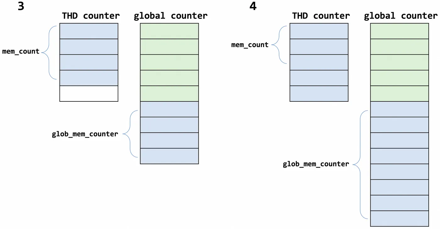 计数器数据操作中session和global数据减少是分离的,global数据的更新总是滞后于session,这同样也可以减少锁的争用,但存在单个do_command操作多次的alloc_cnt和free_cnt导致提前报告OOM错误的可能性(只执行free_cnt,但没有其他session做reset操作)。