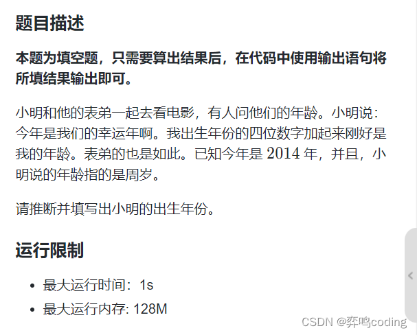 public class Main { public static void main(String[] args) { for(int i= 1950;i<2015;i++){ int[] a = new int [4]; int value = i; int sum = 0; for(int j = 3; j>=0;j--){ a[j] = value%10; value/=10; //求出四位数的和 sum += a[j]; } //根据题目来判断 if(2014-i == sum){ System.out.println(i); } } System.out.println("what"); } }