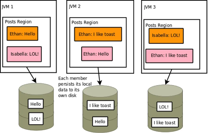 原因是GemFire保证了你完整的数据被在VM重启的时候被恢复。每一个VM只能持久化他自己的post部分。每一个GemFire VM等待直到所有的posts都可用。这阻止你看一个不完全的post region视图。