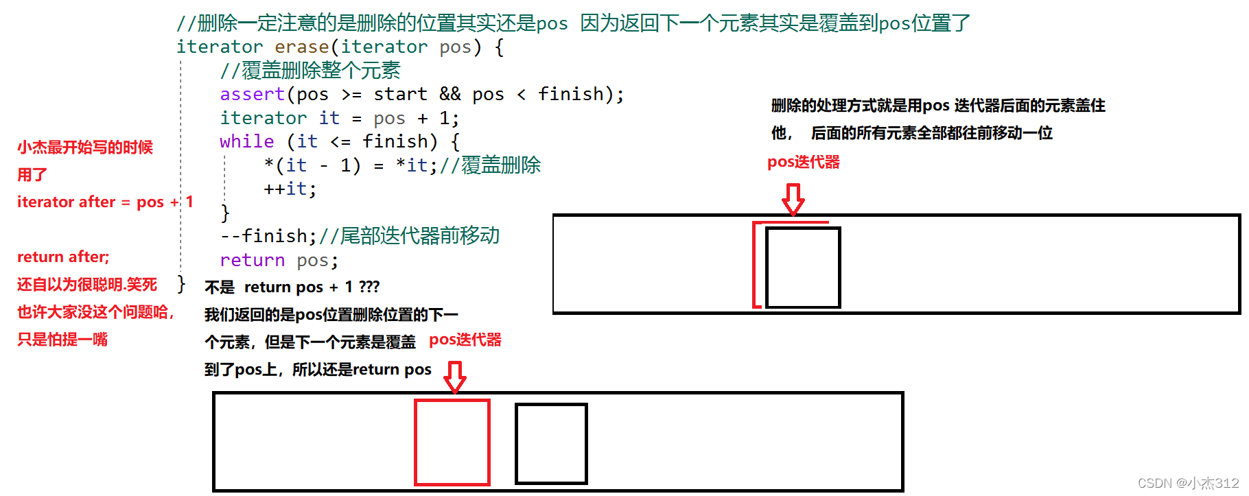 迭代器失效,说白了其实本质是内存问题,扩容后,原来的迭代器全部不可以用了,因为原来的迭代器指向原来的那片空间,可是 扩容后原来那片空间都释放掉了,你如何敢访问,所以每一次关于迭代器的操作我们需要接收返回值就是这个道理,跟新旧的迭代器,避免使用失效迭代器, it = e.erase(it) 不能是 e.erase(it++); ; 因为删除之后你不清楚,it 的情况如何,但是返回迭代器是指向下一个元素的有效迭代器,所以需要接收返回值. 删除it 之后 it 本质是一个失效迭代器了,如何赶直接 ++ 因为他的本质在接收返回值之前还是哪个即将别删除的迭代器