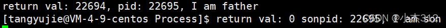 #include <unistd.h> #include <sys/types.h> #include <unistd.h> #include <fcntl.h> #include <stdio.h> int main() { pid_t pid; pid = fork(); if (pid == 0) { // 说明是son printf("return val: %d sonpid: %d, I am son\n", pid, getpid()); sleep(1);//睡一下等儿子先死掉. } else { //说明是 fa printf("return val: %d, pid: %d\n", getpid(), pid); } return 0; }