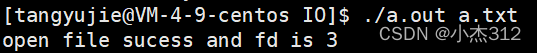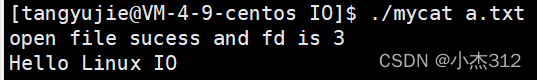 [tangyujie@VM-4-9-centos IO]$ mycat a.txt open file sucess and fd is 3 Hello Linux IO