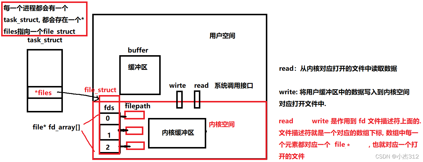 我们可以通过向文件描述符fd 进行写入数据, 和读取数据. why? fd: 句柄, 内核数据结构进行了完善的封装组织, 我们通过简单的操作fd, 系统调用就会将操作对应映射到对应打开的文件上面去. --- Linux下面一切皆为文件思想贯穿整个Linux的底层设计, 掌握清楚了文件IO, 对于后序的各种通信的学习和理解也是至关重要的