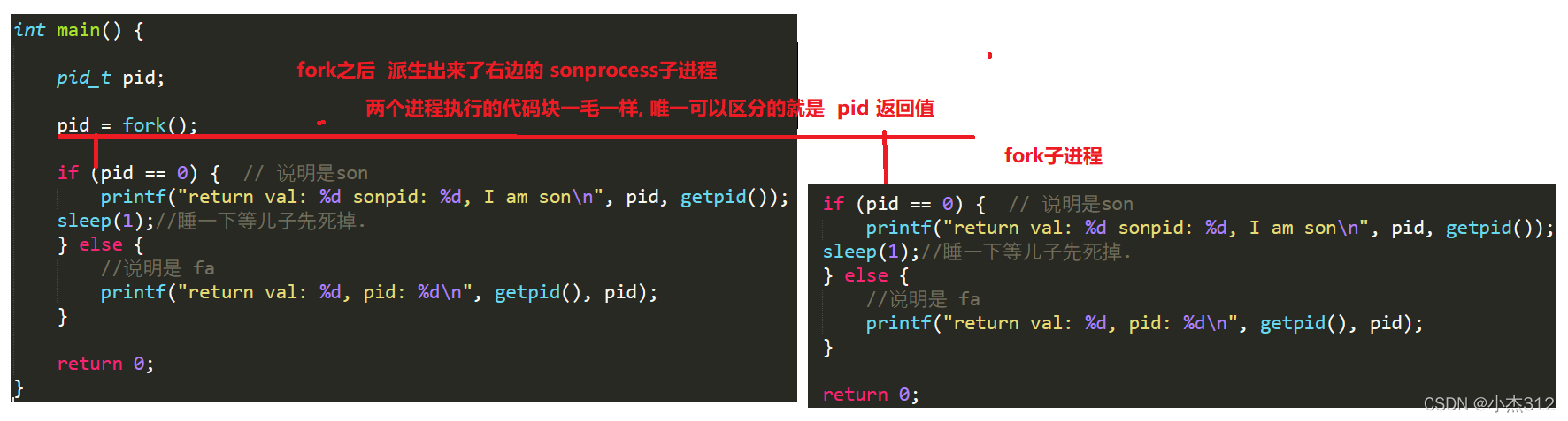 其实精华出现了: 好比是开返回值盲盒. 开到了0 OK 我知道了,我是儿子, 开到了非0 我知道了,我开出来了我儿子的进程id号, 我是爸爸.