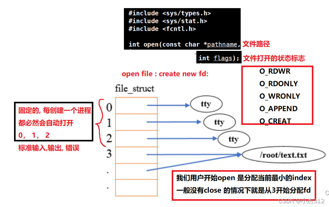 功能: open file and create new fd (lowest-numbered file descriptor)