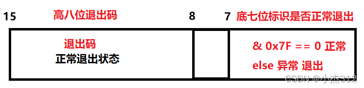 status的实现, 本质是啥? 其实我们应该看成是二进制位, 看成是32位二进制位, 但是我们仅仅只是研究低16位. 底16位的高八位存储的是正常退出的退出码, 低七位标识是否是正常退出的, 也就是信号码 sig code. status & 0x7F 就是 sig code. 终止信号值