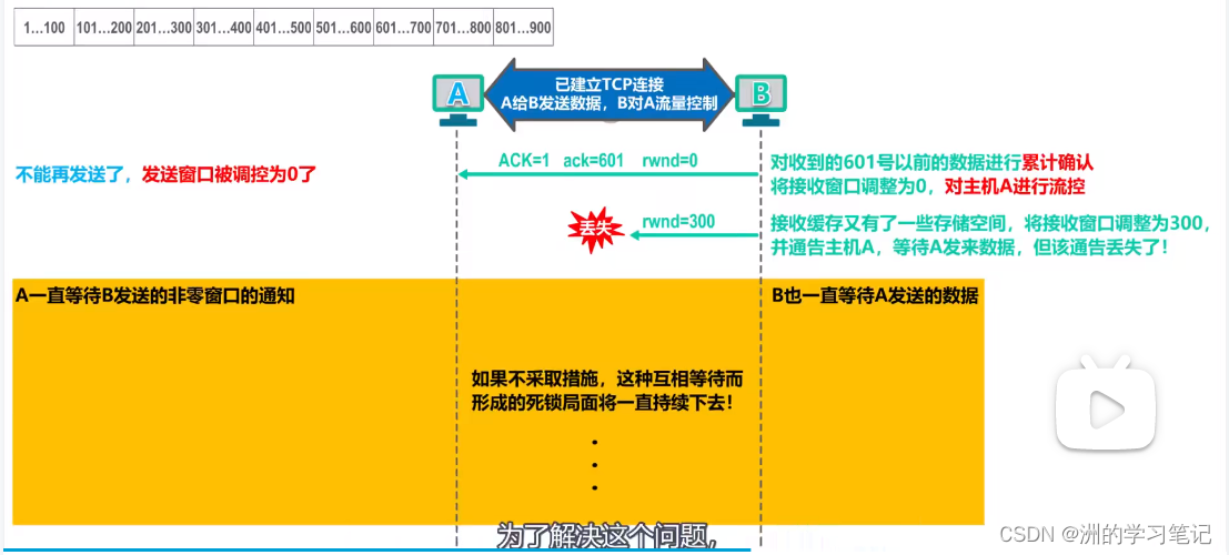 当b的接收缓存又有空间了,b会通知A可以继续发了。但是。