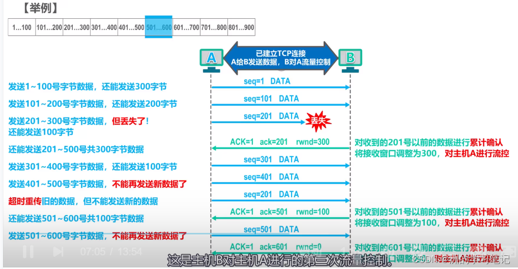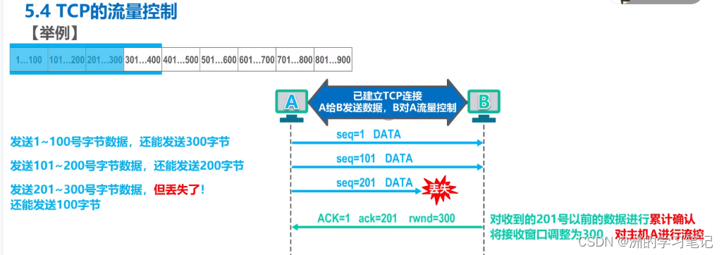 主机A接收之后,移动自己的窗口,(发送的就去掉了),同时A也将自己的发送窗口改为300。同时A可以对1-200删掉。而且是先发送301的,因为需要等待发送200时候的超时重传。