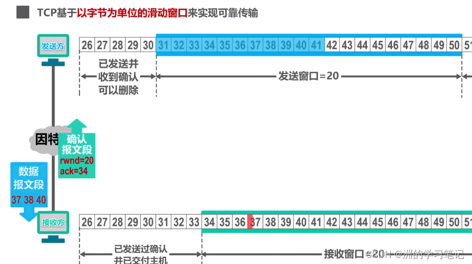 假设现在装有31的数据报文段到了接收方,那么接收方会接收该报文段,并且将31-33存入接收缓存,然后将31-33交付给应用进程,然后给发送发送端发送确认报文,(这个时候滑动窗口已经向前滑动了)。