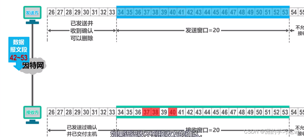 然后发送方将 42-53发出去,但是此时是不知道34-36是没有成功发送的,因为没有接收到接收方发来确认的报文。