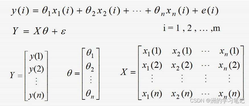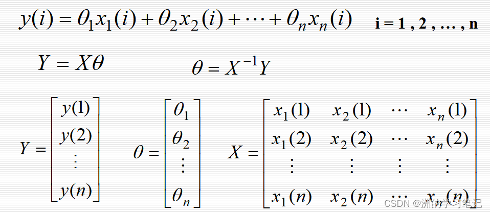 设对输入、输出进行m次观测得到的数据为{ x1( i ),x2(i),…, xn( i ),y ( i ) },i = 1 , 2 , … , m。现在的问题是:怎样根据这些观测数据估计系统的参数θ1,θ2…。