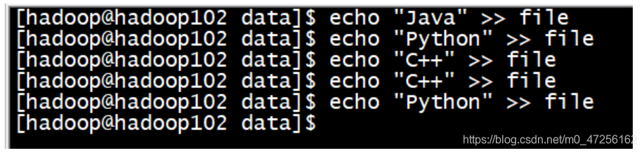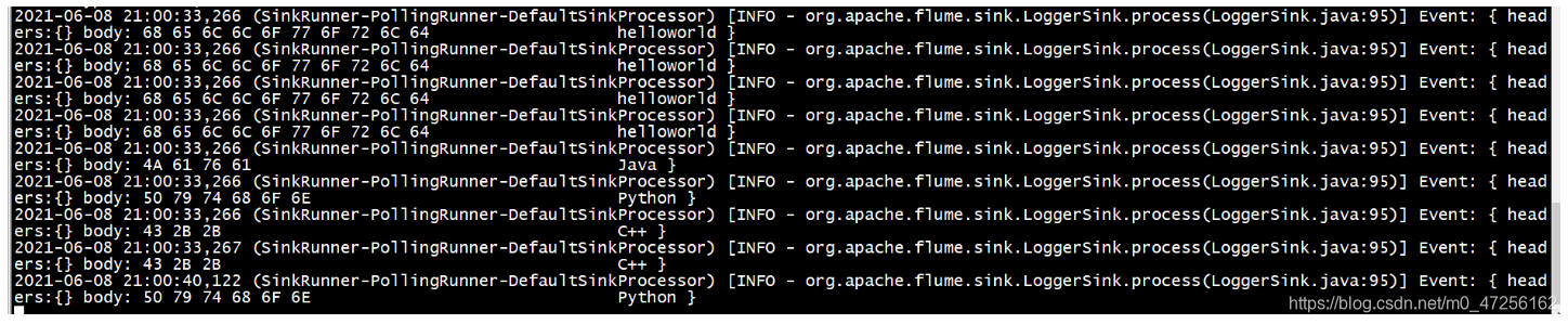 我们使用echo命令不断地向file文件中写入数据,然后再flume端就会监控到我们新添的数据。