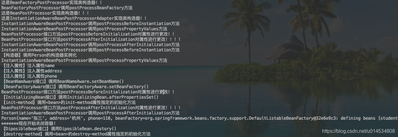 工厂后处理器接口方法:这个包括了AspectJWeavingEnabler, ConfigurationClassPostProcessor, CustomAutowireConfigurer等等非常有用的工厂后处理器接口的方法。工厂后处理器也是容器级的。在应用上下文装配配置文件之后立即调用。