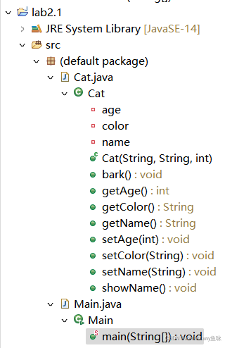题目1工程结构:Cat类中有私有属性属性年龄、名字、毛色,有公有函数函数显示姓名和喊叫,有构造函数和getter/setter。Main类存放主程序,主程序输出毛色、年龄,并调用Cat类中的函数。