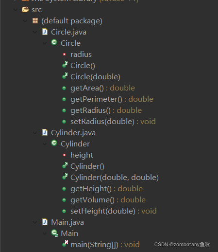 Circle类有一个私有变量radius为double双精度浮点类型。有一个空构造函数、一个参数为圆半径的构造函数。有直接得到周长和面积的getArea()、getPerimeter()方法。还有对radius属性的getter/setter方法。