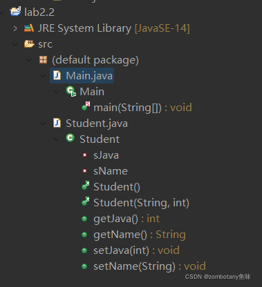 public class Student { private String sName; private int sJava; public Student() { sName=""; sJava=0; } public Student(String _sName,int _sJava) { sName=_sName; sJava=_sJava; } public void setName(String _sName) { sName=_sName; } public void setJava(int _sJava) { sJava=_sJava; } public String getName() { return sName; } public int getJava() { return sJava; } }