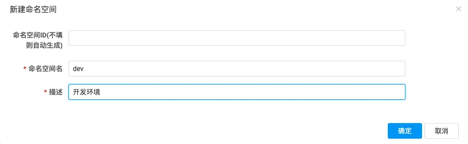 日常开发过程中,我们一般会有dev、test、poc、prod等多个环境,同一个服务不同环境之间因存在代码不一致问题肯定需要做隔离调度,Nacos通过namespace解决此问题,配置页面如下,我们新增一个dev: