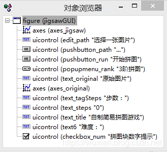 后面的控件可通过类似的方式进行布置与修改,为了方便后面显示图片我们需要两个axes(坐标轴)控件,分别命名为axes_original、axes_jigsaw用于显示原始图片与进行拼图显示的图片。为了能够设置拼图的难易程度,我们添加一个弹出式菜单控件(popupMenu),并在“String”属性中添加多行字符串,每行字符串低代表一个弹出选项,如下: