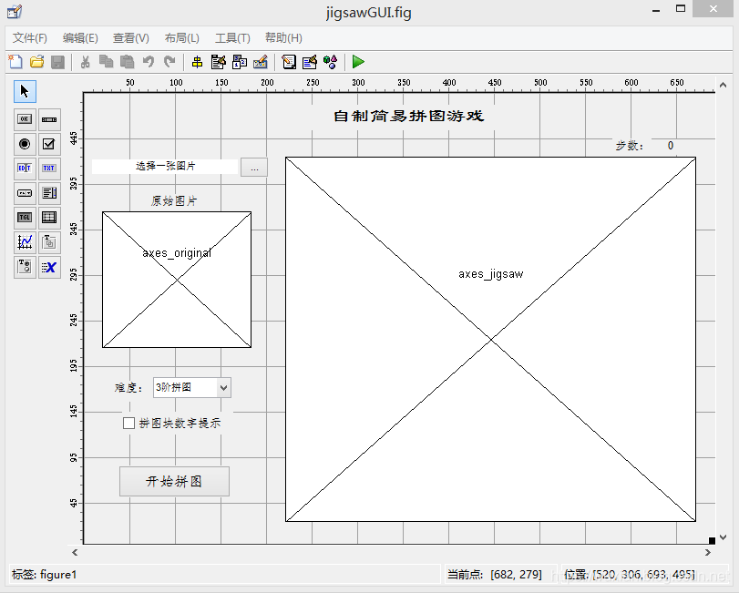 MATLAB为用户提供了强有力的工具——句柄图形,方便对图形的各个方面进行控制。很多时候我们需要一个可以反复使用的实用函数,这时图形界面作为交互方法就显得更有意义,其中利用GUIDE建立GUI是一种简单快捷的设计方式。特别是作为一款小游戏,一个优美简洁的界面将为其增色不少,这节介绍拼图游戏GUI的设计思路与界面制作过程。