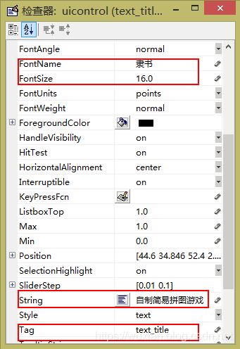 在GUI设计界面中,从左侧的GUI对象选择区依次拖动控件到中间的GUI布局区。每布置好一个控件,为了美观和方便需要重新设置一下控件名字及控件上显示的文字等属性。如拖动一个静态文本控件(带TXT字样的那个)到布局区,并双击该控件调出属性检查器,修改“FontName”字体属性为“隶书”、“FontSize”字体大小为16,、显示的字符串“String”设置为“自制简易拼图游戏”,“Tag”(对象名)属性设置为“text_title”。