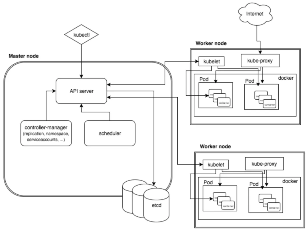 Kubernetes属于主从分布式架构,主要由Master Node和Worker Node组成,以及包括客户端命令行工具Kubectl和其它附加项。