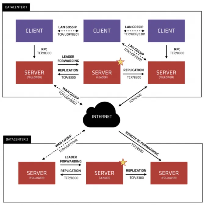 集群内的Consul节点通过gossip协议(流言协议)维护成员关系,也就是说某个节点了解集群内现在还有哪些节点,这些节点是Client还是Server。单个数据中心的流言协议同时使用TCP和UDP通信,并且都使用8301端口。跨数据中心的流言协议也同时使用TCP和UDP通信,端口使用8302。