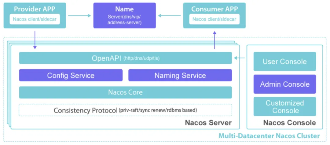 Nacos 支持基于 DNS 和基于 RPC 的服务发现。服务提供者使用 原生SDK、OpenAPI、或一个独立的Agent TODO注册 Service 后,服务消费者可以使用DNS TODO 或HTTP&API查找和发现服务。