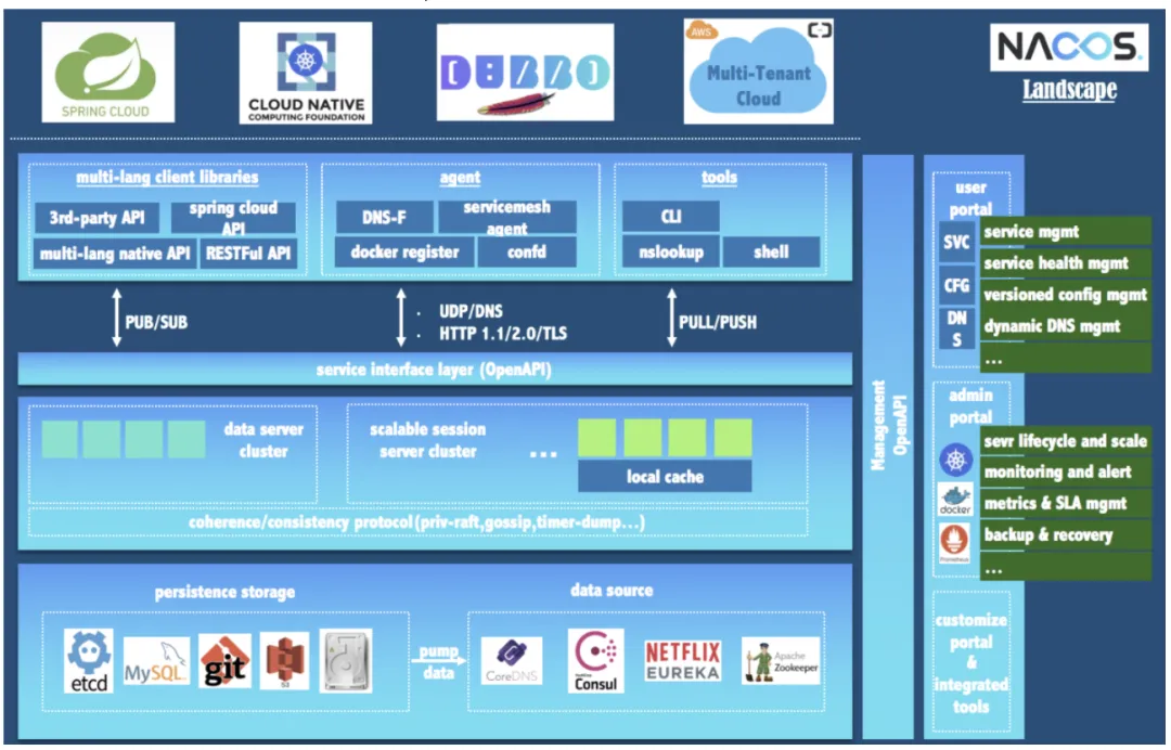Nacos 能让您从微服务平台建设的视角管理数据中心的所有服务及元数据,包括管理服务的描述、生命周期、服务的静态依赖分析、服务的健康状态、服务的流量管理、路由及安全策略、服务的 SLA 以及最首要的 metrics 统计数据。