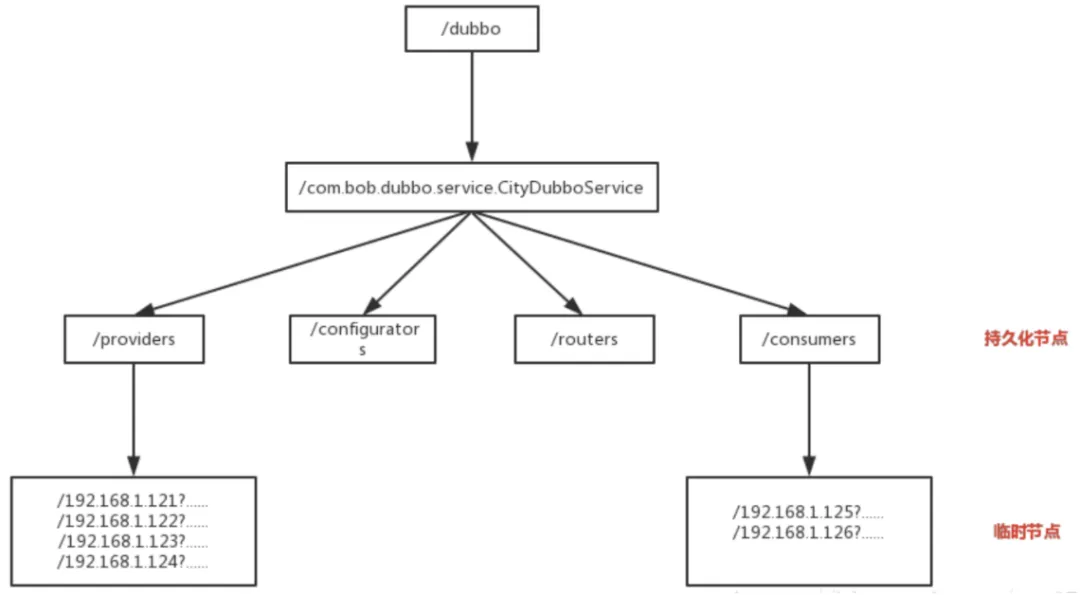 该节点承担着最重要的职责,它由服务提供者(发布服务时)创建,以供服务消费者获取节点中的信息,从而定位到服务提供者真正IP,发起调用。通过IP设置为临时节点,那么该节点数据不会一直存储在 ZooKeeper 服务器上。