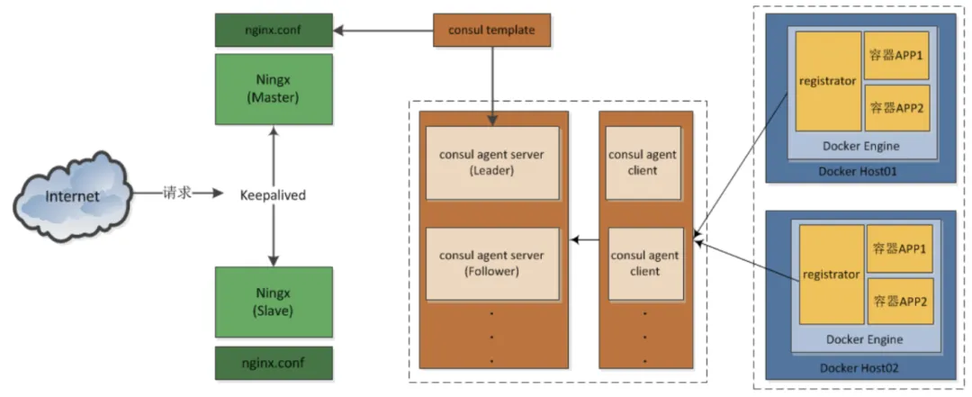 Consul Template:定时从注册中心服务端获取最新的服务提供者节点列表并刷新 LB 配置(比如 Nginx 的 upstream),这样服务消费者就通过访问 Nginx 就可以获取最新的服务提供者信息,达到动态调节负载均衡的目的。