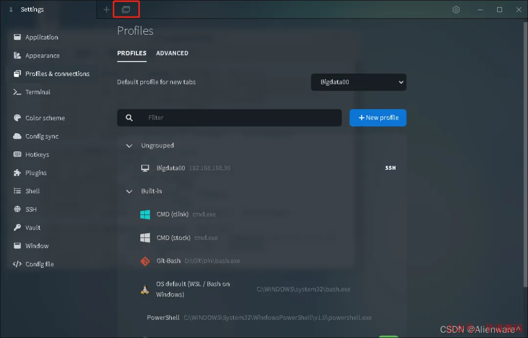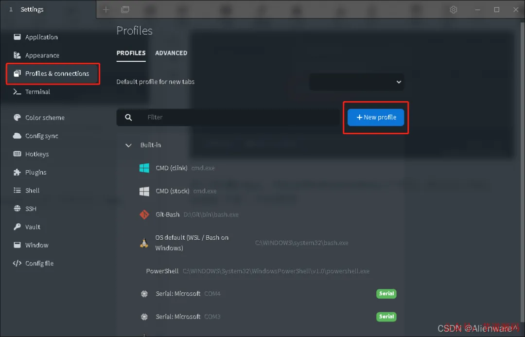 进入到设置页面后,选择 profiles&connections 这个选项,然后点击「New profile」新建一个终端配置