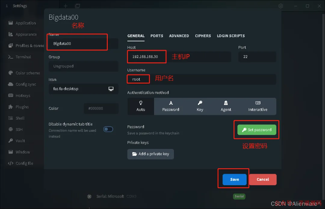 随后就会弹出配置 ssh 连接的信息,填上终端名称、IP 地址、端口号、账号密码就可以了。