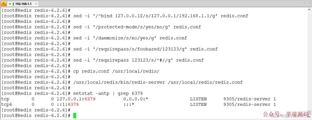 [root@Redis ~]# wget https://download.redis.io/releases/redis-6.2.6.tar.gz [root@Redis ~]# tar zxf redis-6.2.6.tar.gz [root@Redis ~]# cd redis-6.2.6 [root@Redis redis-6.2.6]# make PREFIX=/usr/local/redis install [root@Redis redis-6.2.6]# sed -i '/^bind 127.0.0.1/s/127.0.0.1/192.168.1.1/g' redis.conf # 修改监听 IP [root@Redis redis-6.2.6]# sed -i '/protected-mode/s/yes/no/g' redis.conf # 关闭保护模式 [root@Redis redis-6.2.6]# sed -i '/daemonize/s/no/yes/g' redis.conf # 开启后台运行 [root@Redis redis-6.2.6]# sed -i '/requirepass/s/foobared/123123/g' redis.conf # 配置密码 [root@Redis redis-6.2.6]# sed -i '/requirepass 123123/s/^#//g' redis.conf # 将密码前的 # 删除 [root@Redis redis-6.2.6]# cp redis.conf /usr/local/redis/ [root@Redis redis-6.2.6]# /usr/local/redis/bin/redis-server /usr/local/redis/redis.conf # 启动 Redis