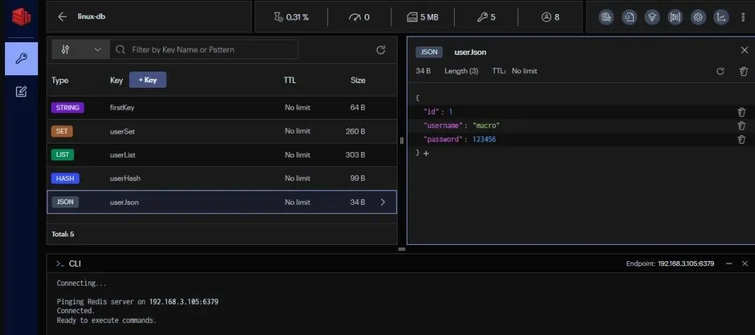 RedisInsight 是一个直观高效的 Redis GUI 管理工具,它可以对 Redis 的内存、连接数、命中率以及正常运行时间进行监控,并且可以在界面上使用 CLI 和连接的 Redis 进行交互(RedisInsight 内置对 Redis 模块支持):