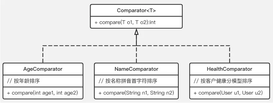 还有一种做法,可以实现对扩展开放对修改关闭,JDK的排序其实已经为我们定义了这样的标准。我们将不同的排序方式进行抽象,每种逻辑单独实现,单个调整逻辑不影响其他内容,新增排序方式也无需对已有模块进行调整。
