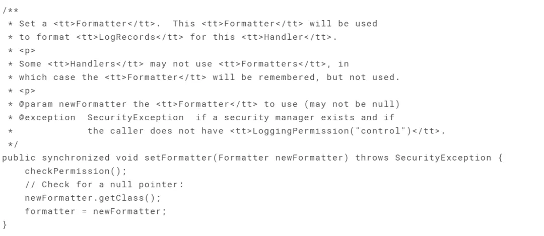 在分享会上,我故意将这行注释遮盖起来,大家都猜不到 newFormatter.getClass() 这句代码写在这里的作用。如果要检查空指针,完全可以用Objects工具类提供的方法,实现完全一样,但代码表现出来的含义就千差万别了。
