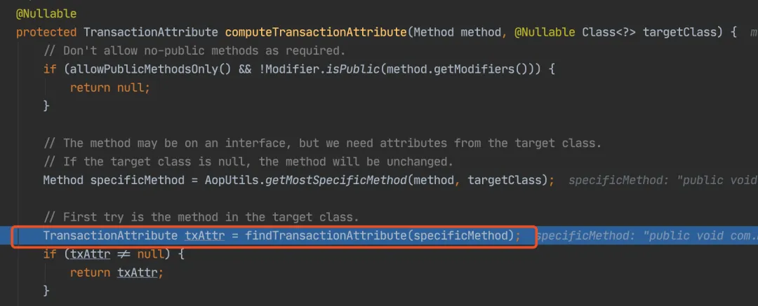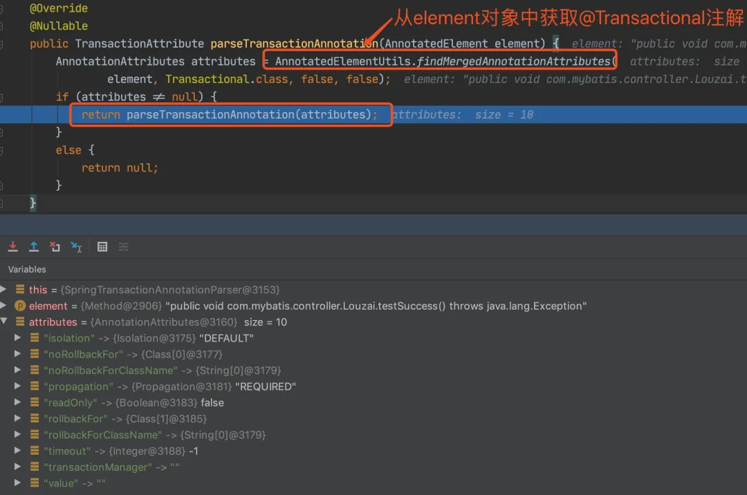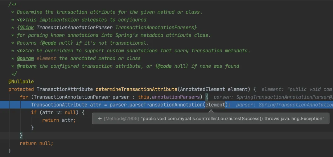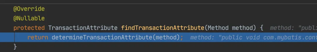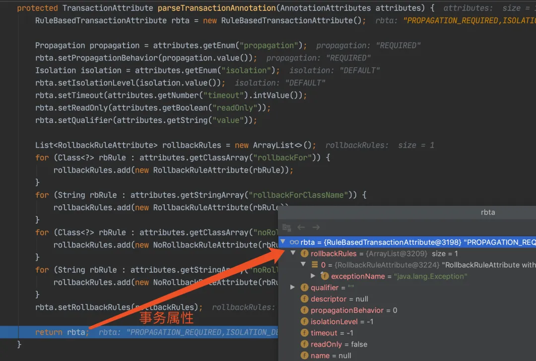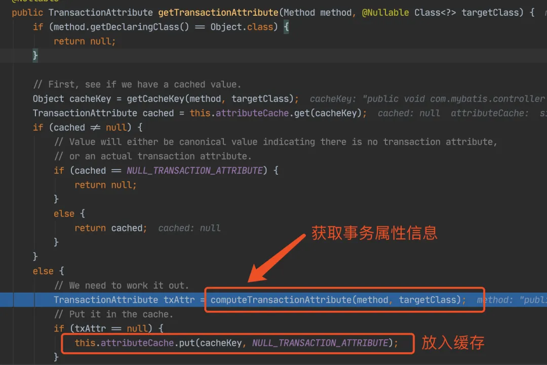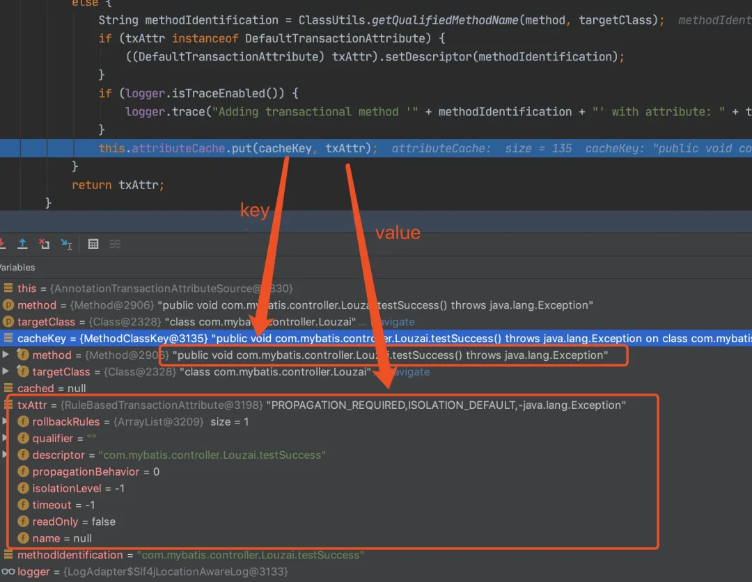 我们依次返回到 getTransactionAttribute(),再看看放入缓存中的数据。
