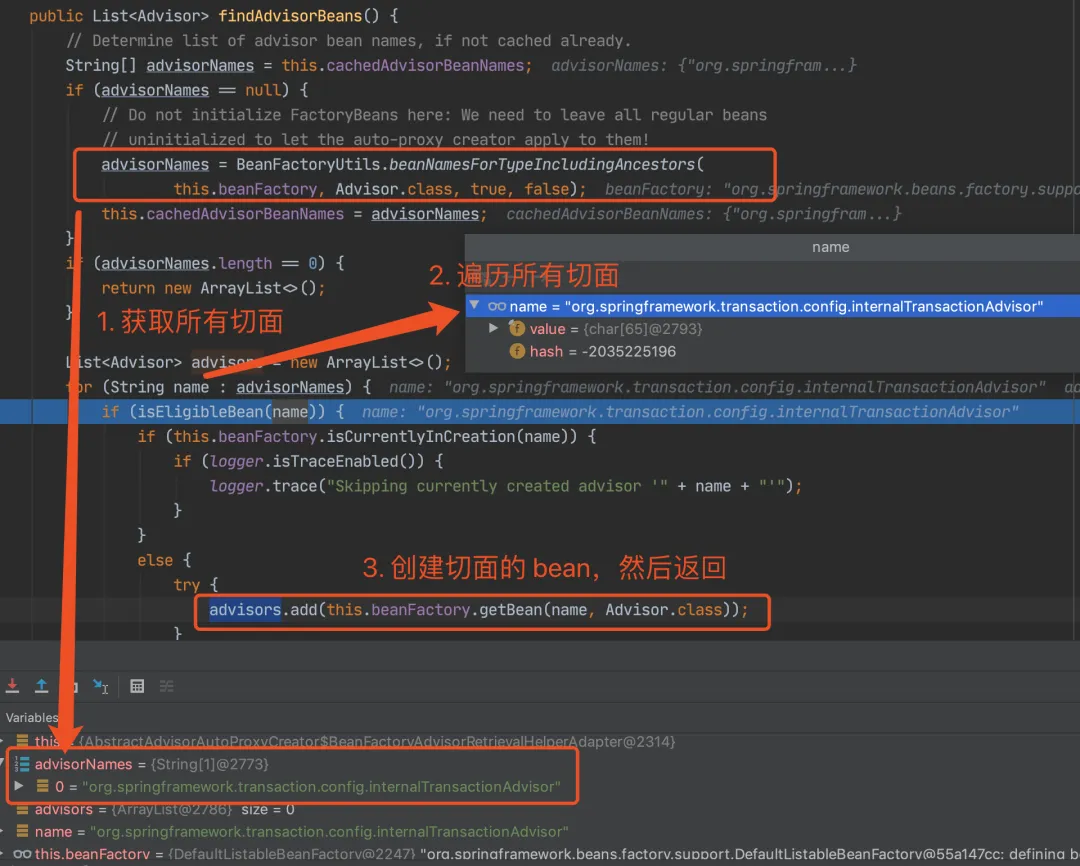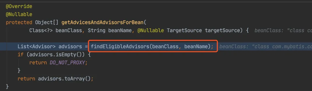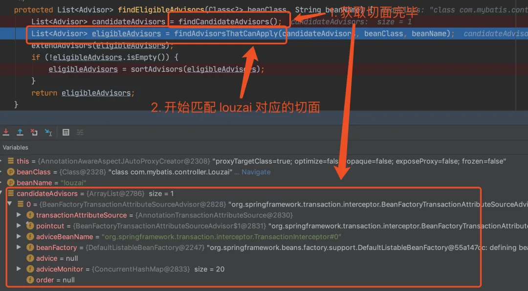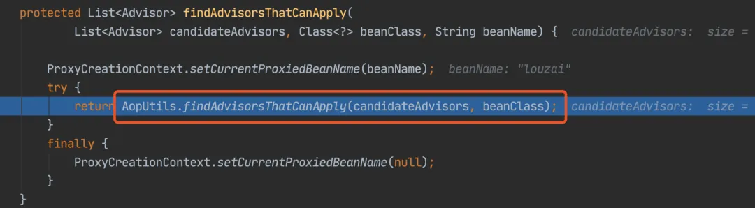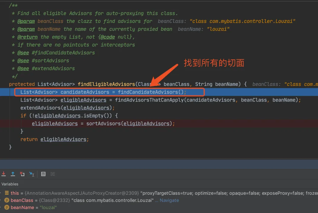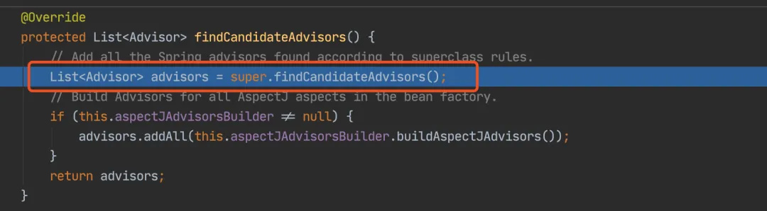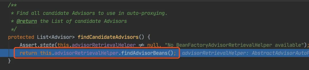 这里有 2 个重要的方法,先执行 findCandidateAdvisors(),待会我们还会再返回 findEligibleAdvisors()。