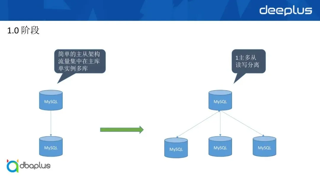 1.0阶段对于所有互联网公司而言,其实都有类似的架构——简单的主从,所有流量集中在一个主库上。另外,与以前使用的商业数据库类似场景——单实例多库。这种架构在公司刚起步的时候是比较方便的,便于业务的快速迭代,但是随着流量的增长,会出现以下几个问题: