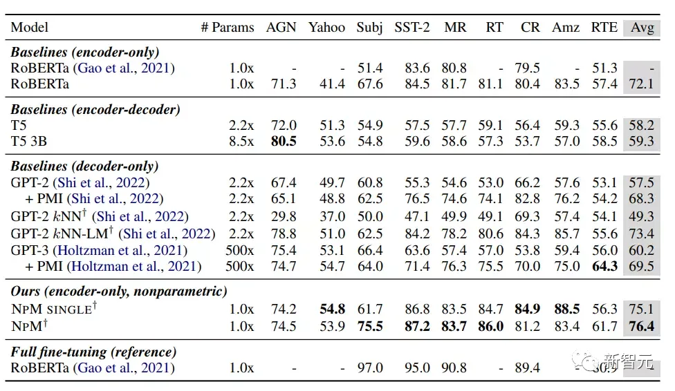 在参数化模型中,RoBERTa取得了最好的性能,出人意料地超过了包括GPT-3等在内的模型,可能是因为纯编码器模型的双向性起到了至关重要的作用,这也表明,因果语言模型可能不是一个合适的分类选择。