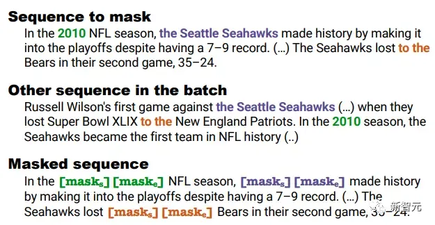 假设被mask的片段是the Seattle Seahawks,在测试时,模型应该从参考语料库的其他序列中检索出the Seattle Seahawks这一短语。