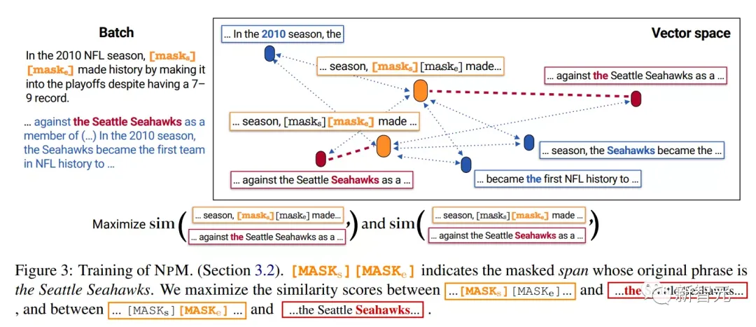 因此,训练的目标应该鼓励[MASKs]的向量更接近于the Seattle Seahawks中的the,而与其他token相距较远,并且不应该是任意一个短语中的the,比如become the first中。