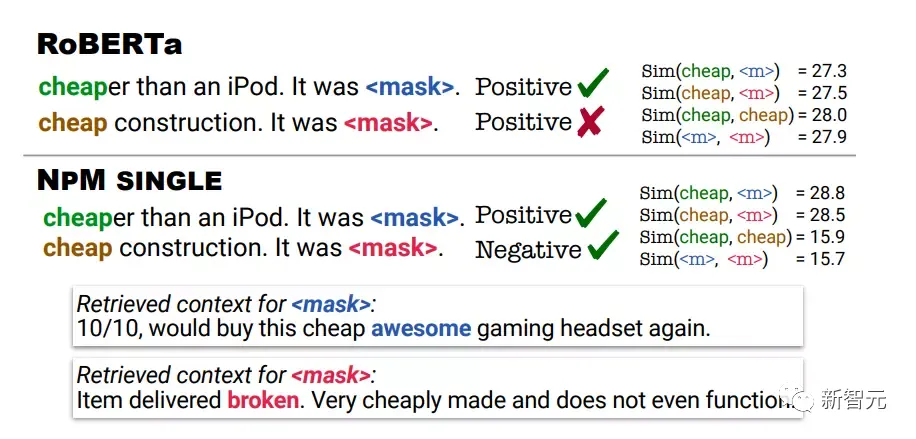 RoBERTa对这两个例子的预测都是正向的,而NPM通过检索在与输入相同的语境中使用cheap的语境,做出了正确的预测。