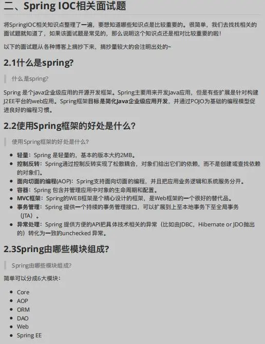 无论是入门还是面试,理解AOP和IOC都是非常重要的。在面试的时候,我没怎么被问过MyBatis/Hibernate/Struts2这样的框架,而Spring就经常被问到。