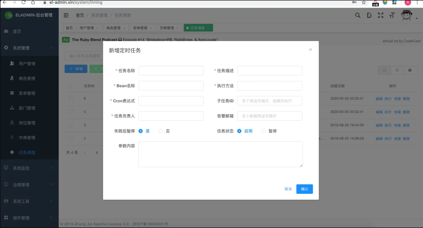 - 定时任务:整合Quartz做定时任务,加入任务日志,任务运行情况一目了然
