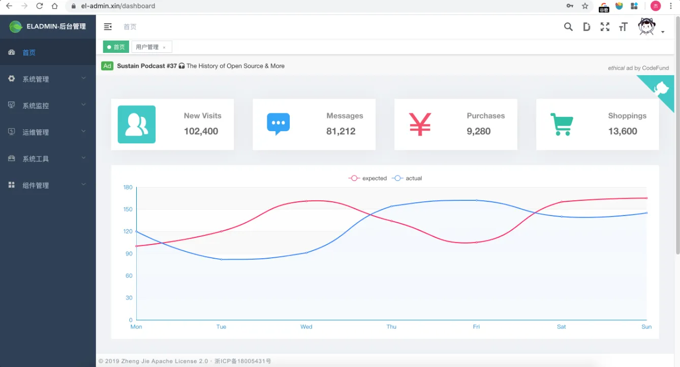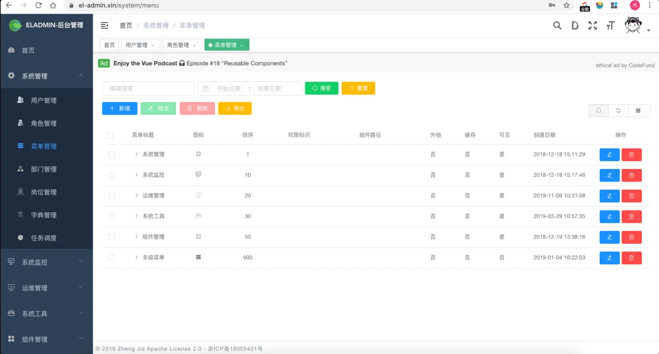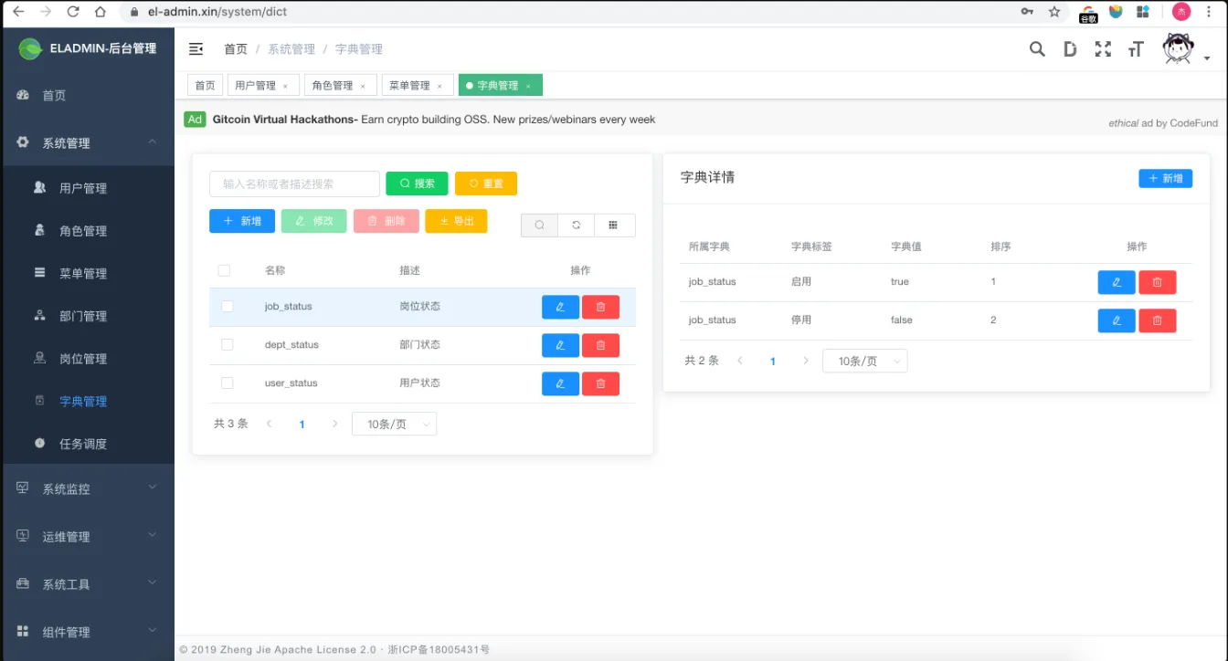 eladmin 是一款基于 Spring Boot 2.1.0 、 Jpa、 Spring Security、redis、Vue 的前后端分离的后台管理系统,项目采用分模块开发方式, 权限控制采用 RBAC,支持数据字典与数据权限管理,支持一键生成前后端代码,支持动态路由。