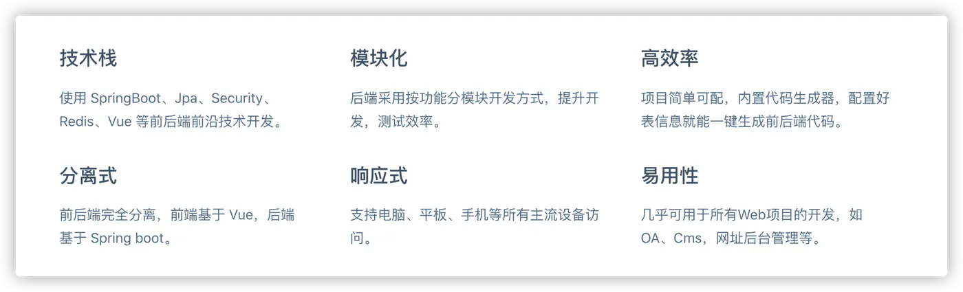 - 代码生成:高灵活度生成前后端代码,减少大量重复的工作任务