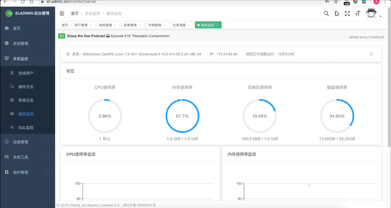 - 支持在线用户管理与服务器性能监控,支持限制单用户登录